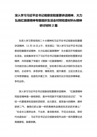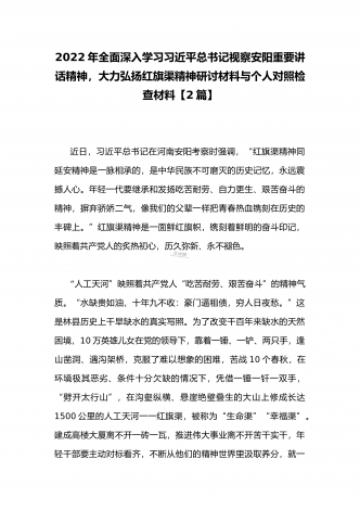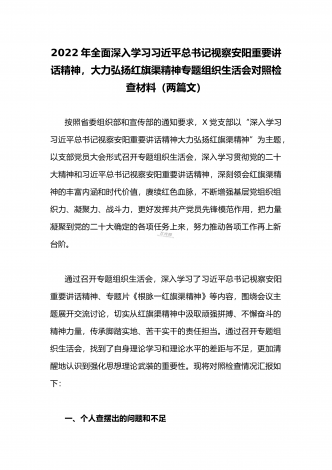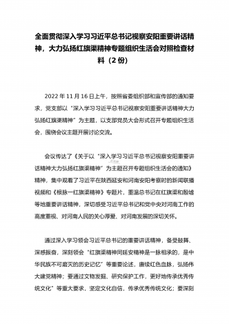 2022年全面深入学习习近平总书记视察安阳重要讲话精神,大力弘扬红旗渠精神专题组织生活会对照检查材料(两篇文)