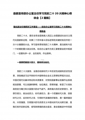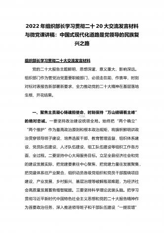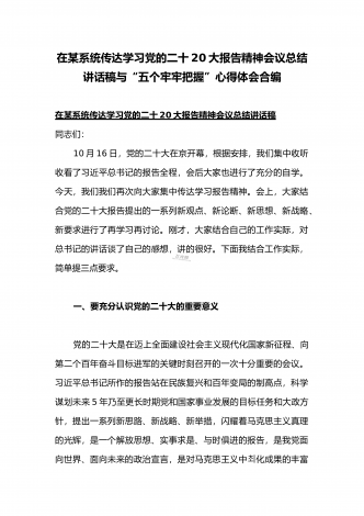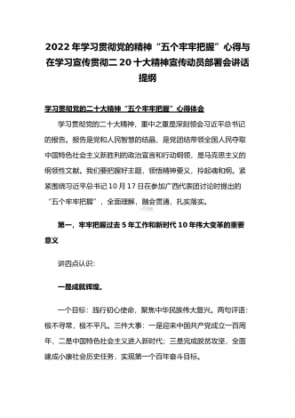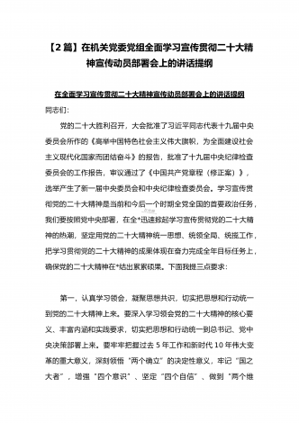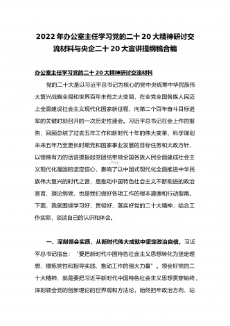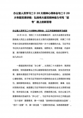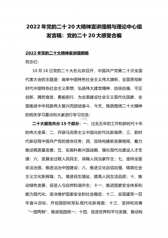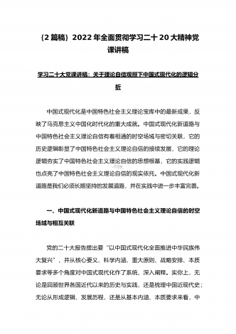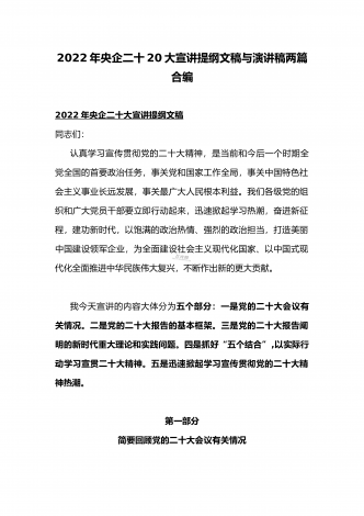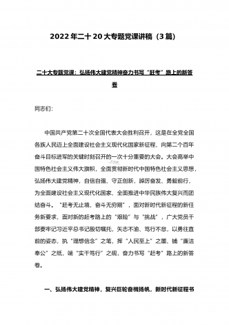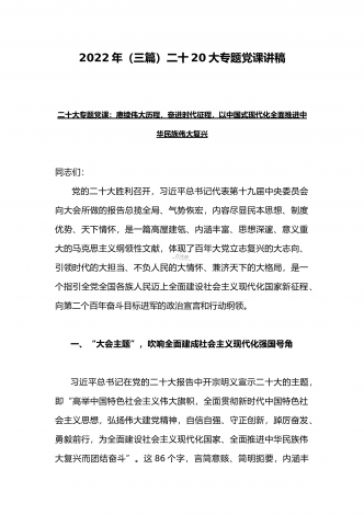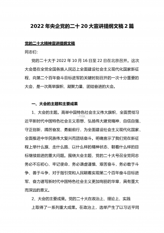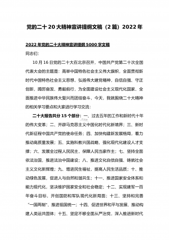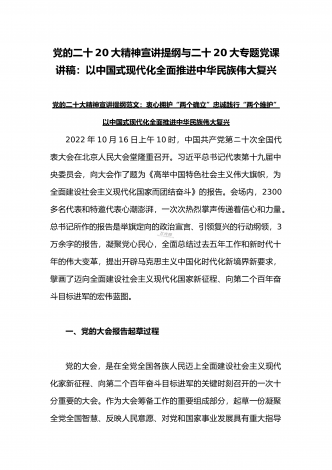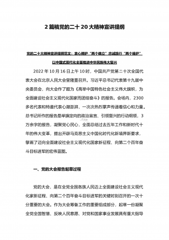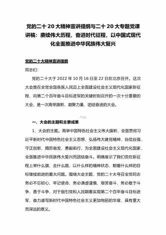 党的二十20大精神宣讲提纲与二十20大专题党课讲稿:赓续伟大历程,奋进时代征程,以中国式现代化全面推进中华民族伟大复兴党的二十大精神宣讲提纲同志们:党的二十大于2022年10月16日至22日在北京召开。这次大会是在全党全国各族人民迈上全面建设社会主义现代化国家新征程、向第二个百年奋斗目标进军的关键时刻召开的一次十分重要的大会,是一次高举旗帜、凝聚力量、团结奋进的大会。一、大会的主题和主要成果1、大会的主题。高举中国特色社会主义伟大旗帜,全面贯彻习近平新时代中国特色社会主义思想,弘扬伟大建党精神,...