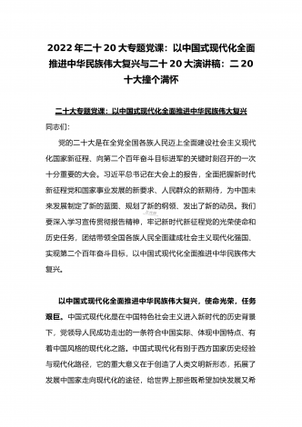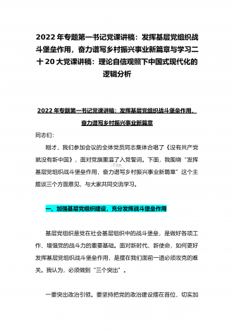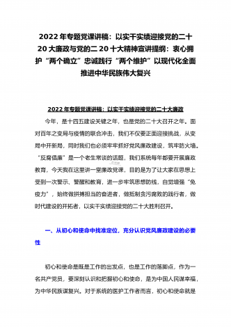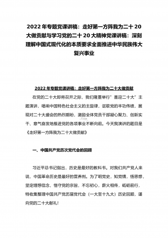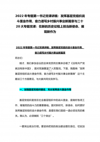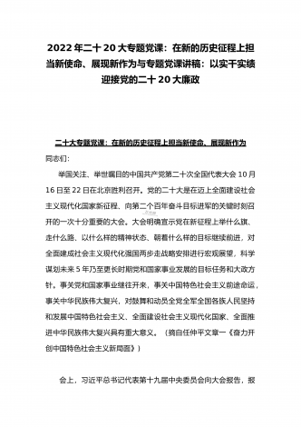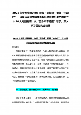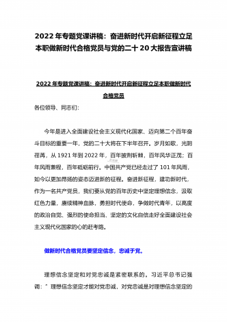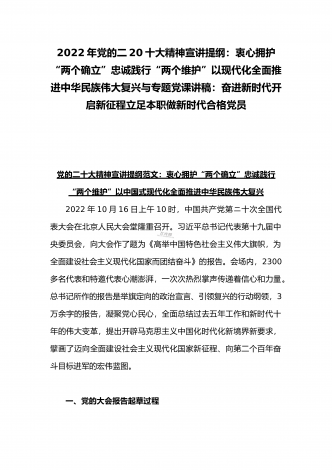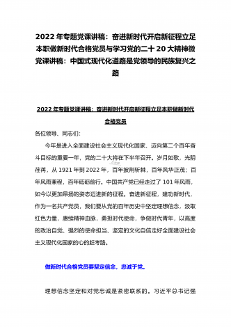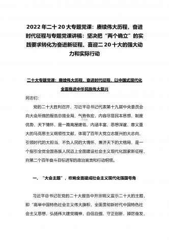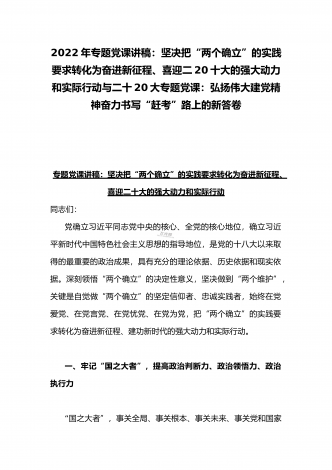 2022年专题党课讲稿:坚决把“两个确立”的实践要求转化为奋进新征程、喜迎二20十大的强大动力和实际行动与二十20大专题党课:弘扬伟大建党精神奋力书写“赶考”路上的新答卷专题党课讲稿:坚决把“两个确立”的实践要求转化为奋进新征程、喜迎二十大的强大动力和实际行动同志们:党确立习近平同志党中央的核心、全党的核心地位,确立习近平新时代中国特色社会主义思想的指导地位,是党的十八大以来取得的最重要的政治成果,具有充分的理论依据、历史依据和现实依据。深刻领悟“两个确立”的决定性意义,坚决做到“两个维护”,关...