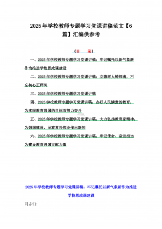 2025年纪检机关纪委监委专题党课讲稿:牢记职责使命,永远担当作为,争做忠诚干净担当的纪检监察铁军与2025年党风廉政建设专题学习辅导党课讲稿:党员干部要上好党性修养作为“第一课”,做对党忠诚、信仰坚定、清正廉洁的笃行者【2篇文】2025年纪检机关纪委监委专题党课讲稿:牢记职责使命,永远担当作为,争做忠诚干净担当的纪检监察铁军同志们:自今年年初以来,在中央纪委、国家监委统一部署下,在全国纪检监察队伍开展了教育整顿工作,其中有一项重要任务,及时领导带头讲党课。为认真落实这一精神,扎实推进各项工作,...