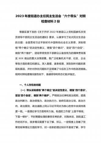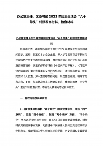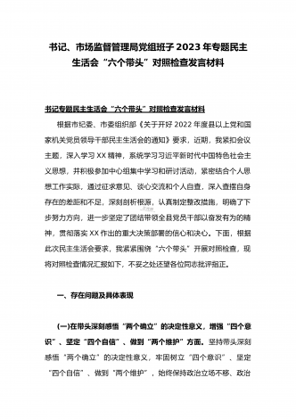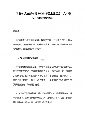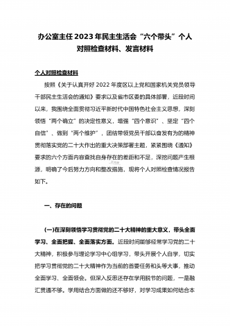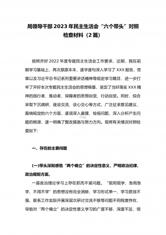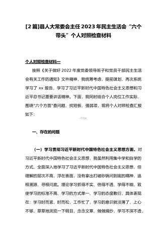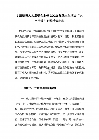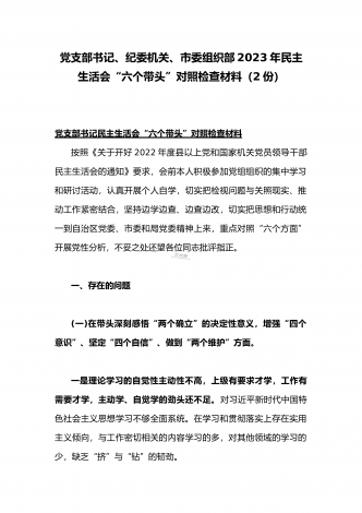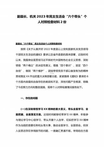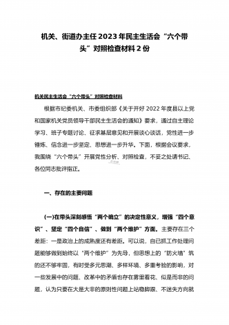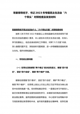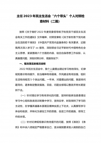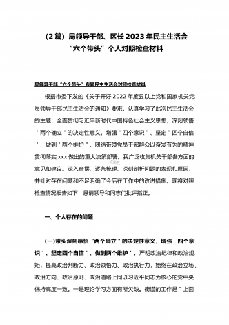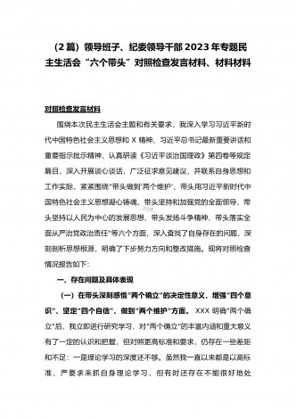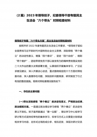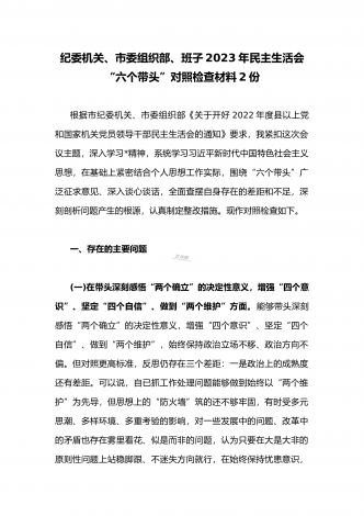 (两篇)2023年纪委领导干部、县委常委、统战部长专题民主生活会“六个带头”对照检查材料、发言材料2023年纪委领导干部“六个带头”民主生活会个人对照检查材料按照区纪委、区组织部《关于开好2022年度县以上党和国家机关党员领导干部民主生活会的通知》文件建设,我认真研读上级文件要求,主动与班子成员进行了谈心谈话,并紧密结合个人思想、学习和工作实际,采取他人提、自己找、集体议等方式,逐个对照、逐条查找、逐项梳理,找准查实存在的突出问题,深入进行党性分析,深挖问题根源,有针对性地制定整改措施。现将个人...