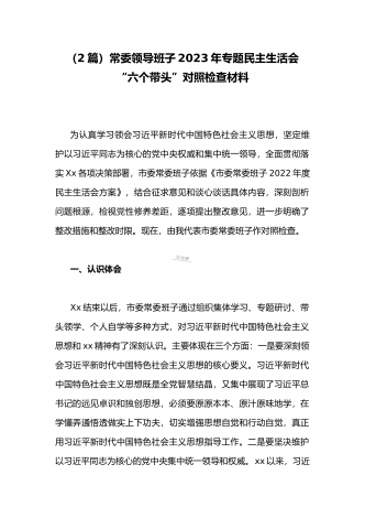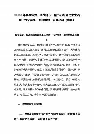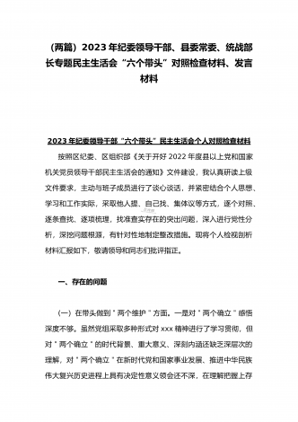 (两篇)2023年纪委领导干部、县委常委、统战部长专题民主生活会“六个带头”对照检查材料、发言材料
