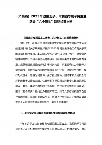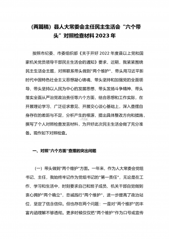 2023年县委常委、统战部长、市委常委、副市长民主生活会“六个带头”对照检查材料、发言材料(两份)