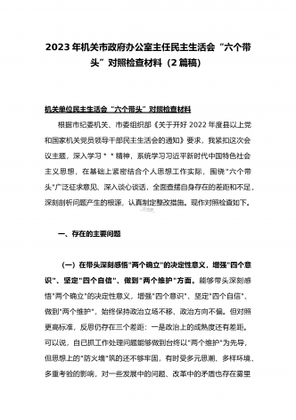 2023年县委常委、统战部长、市委常委、副市长民主生活会“六个带头”对照检查材料、发言材料(两份)县委常委、统战部长专题民主生活会“六个带头”对照检查发言材料按照市纪委机关、市委组织部《关于认真开好2022年度县以上党和国家机关党员领导干部民主生活会的通知》要求,聚焦此次民主生活会主题,我深入学习习近平新时代中国特色社会主义思想和xxx精神、习近平总书记关于统战工作重要讲话和指示批示精神,自觉把思想和行动统一到党中央重大决策部署上来,同时,积极与其他班子成员开展谈心谈话,广泛征求基层意见建议,重...