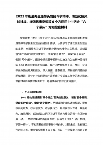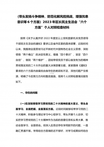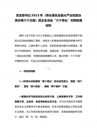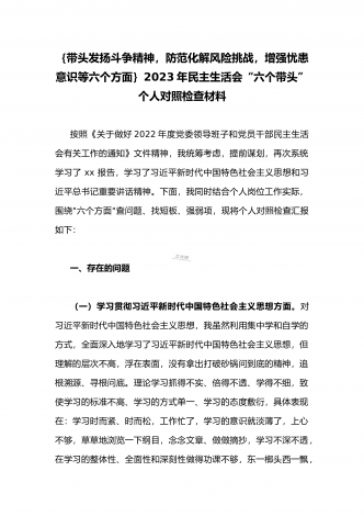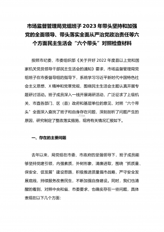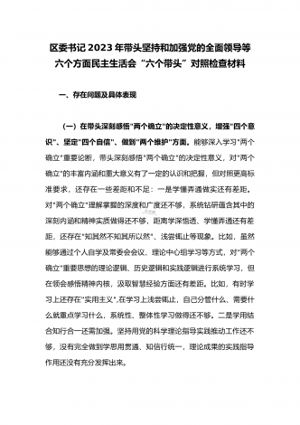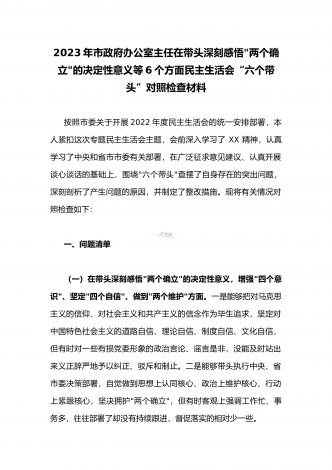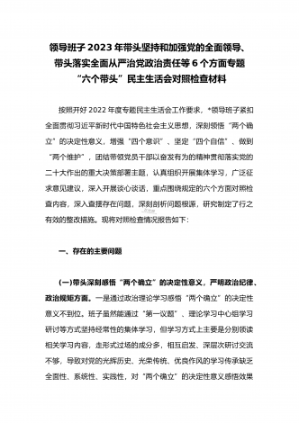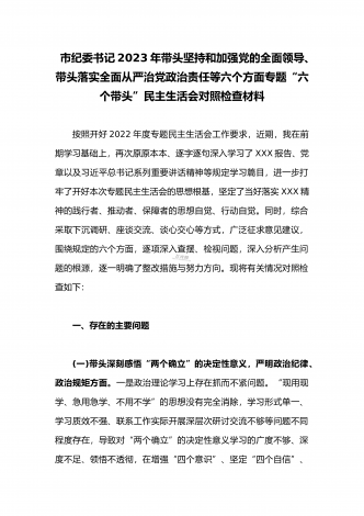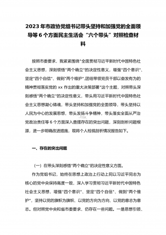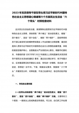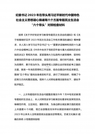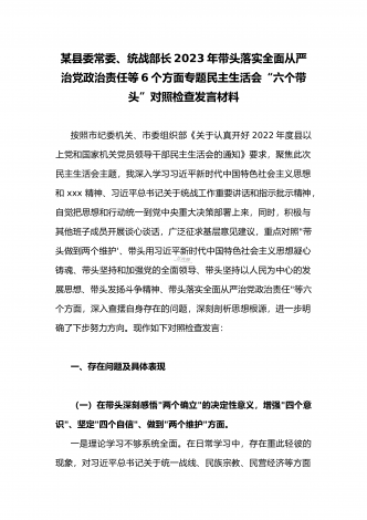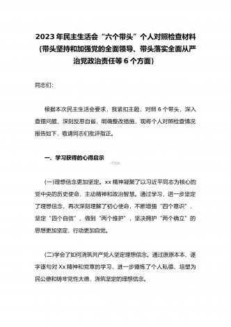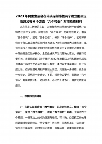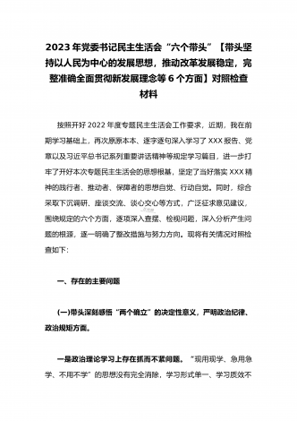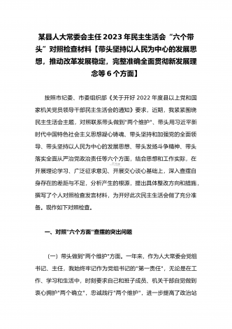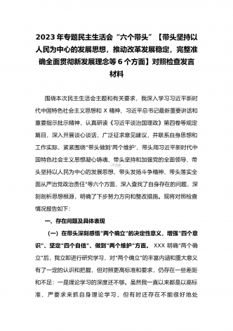 2023年县委常委、组织部长带头坚持以人民为中心的发展思想,推动改革发展稳定,完整准确全面贯彻新发展理念等6个方面专题民主生活会“六个带头”对照检查发言材料按照上级通知要求和市委统一安排,聚焦2022年度民主生活会主题,我深入学习习近平新时代中国特色社会主义思想和XXX精神、习近平总书记最新重要讲话精神,自觉把思想和行动统一到党中央重大决策部署上来,同时,注重与其他班子成员、分管单位和联系乡镇同志沟通交流,广泛听取意见建议,紧紧围绕"带头做到'两个维护'、带头用习近平新时代中...