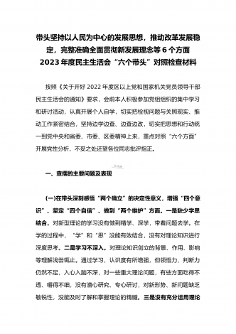2023年县委常委、组织部长带头坚持以人民为中心的发展思想,推动改革发展稳定,完整准确全面贯彻新发展理念等6个方面专题民主生活会“六个带头”对照检查发言材料