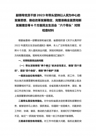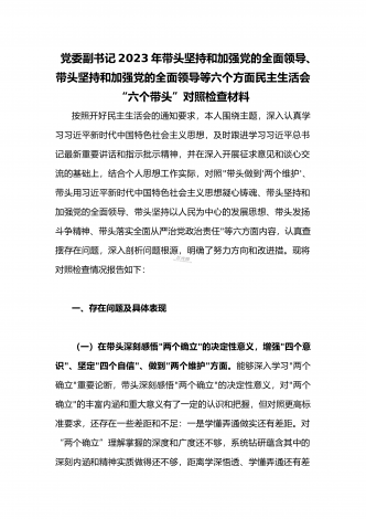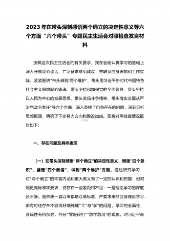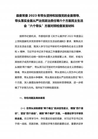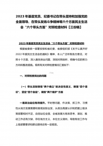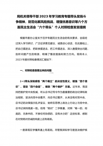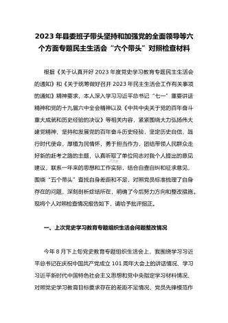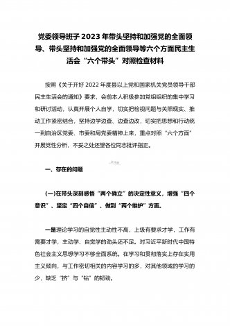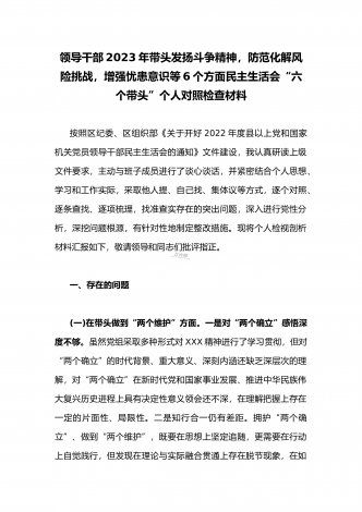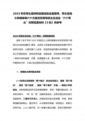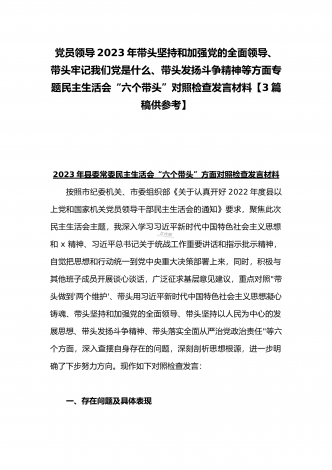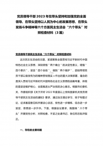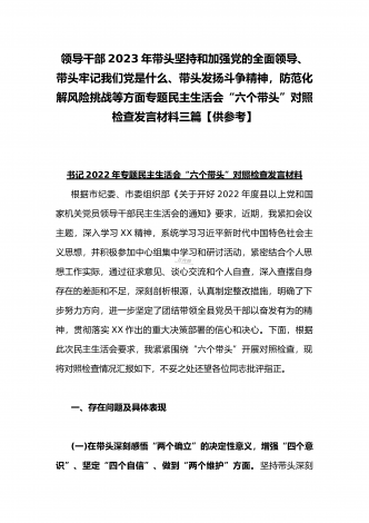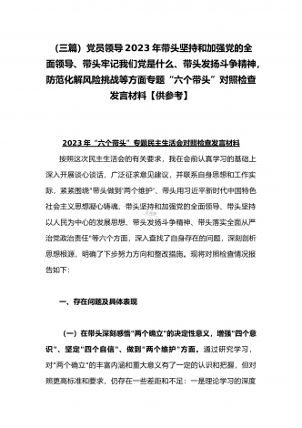 领导干部2023年带头坚持和加强党的全面领导、带头牢记我们党是什么、带头发扬斗争精神,防范化解风险挑战等方面专题民主生活会“六个带头”对照检查发言材料三篇【供参考】