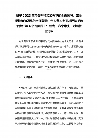 领导干部2023年带头坚持和加强党的全面领导、带头牢记我们党是什么、带头发扬斗争精神,防范化解风险挑战等方面专题民主生活会“六个带头”对照检查发言材料三篇【供参考】书记2022年专题民主生活会“六个带头”对照检查发言材料根据市纪委、市委组织部《关于开好2022年度县以上党和国家机关党员领导干部民主生活会的通知》要求,近期,我紧扣会议主题,深入学习XX精神,系统学习习近平新时代中国特色社会主义思想,并积极参加中心组集中学习和研讨活动,紧密结合个人思想工作实际,通过征求意见、谈心交流和个人自查,深入...