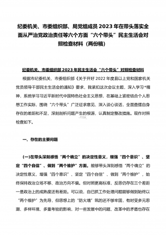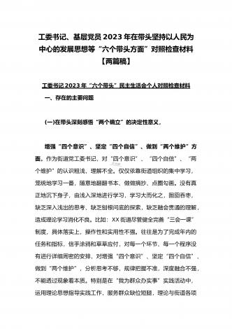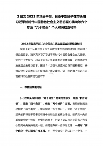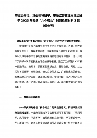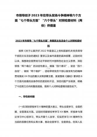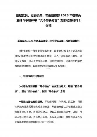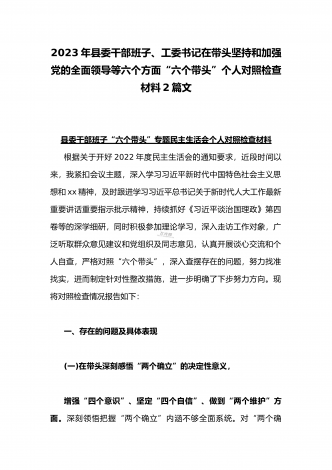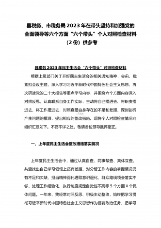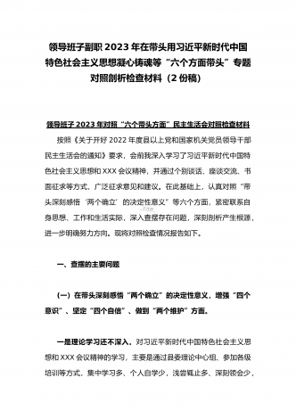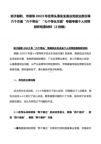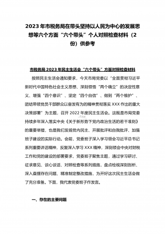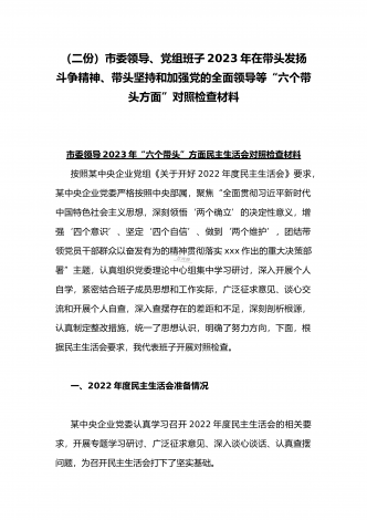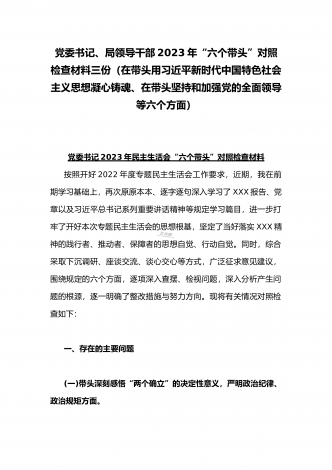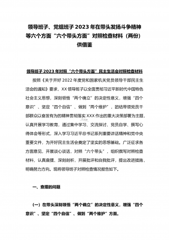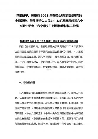 党组书记、党员领导班子2023年在带头坚持和加强党的全面领导、在带头坚持以人民为中心的发展思想、在带头发扬斗争精神等方面专题“六个带头”对照检查材料【3份】党组书记2023年专题民主生活会“六个带头”对照检查材料按照《关于开好2022年度县以上党和国家机关党员领导干部民主生活会的通知》要求,会前我紧扣会议主题,带领班子成员深入学习相关精神,系统学习习近平新时代中国特色社会主义思想,并在广泛征求意见、深入谈心交流的基础上,紧密结合个人思想工作实际,重点围绕“六个带头”深入查摆自身存在的差距和不足,...