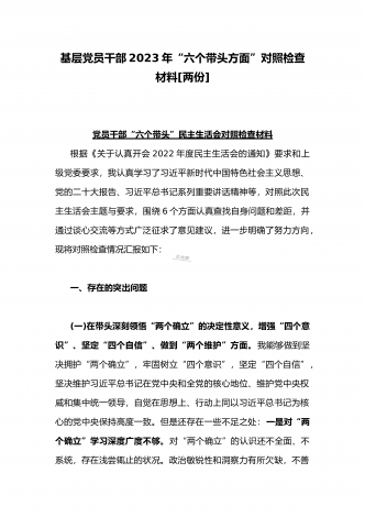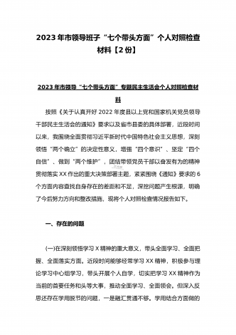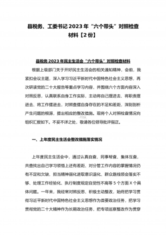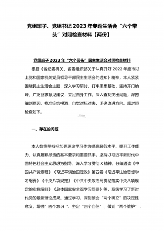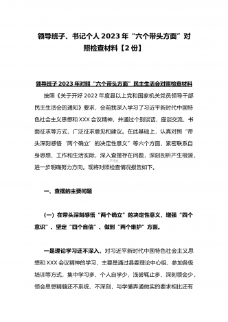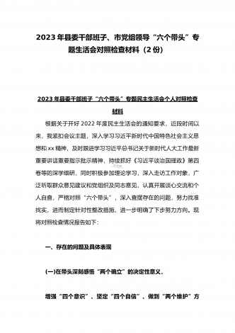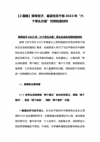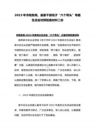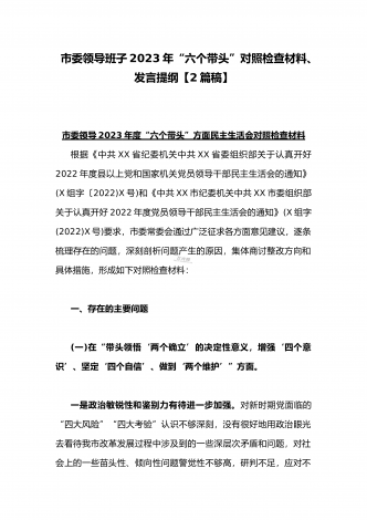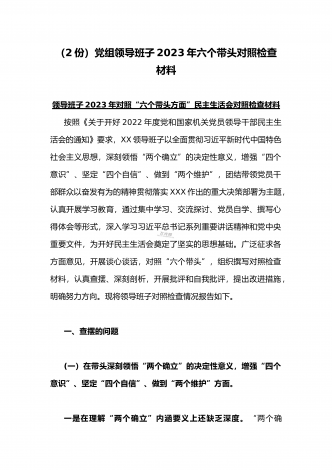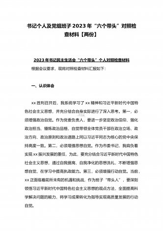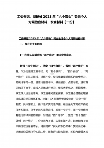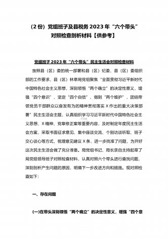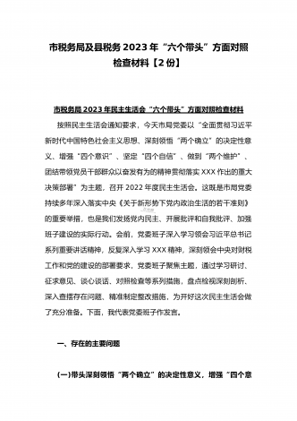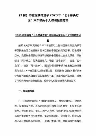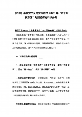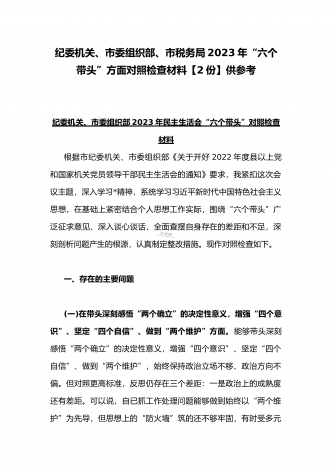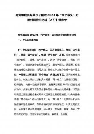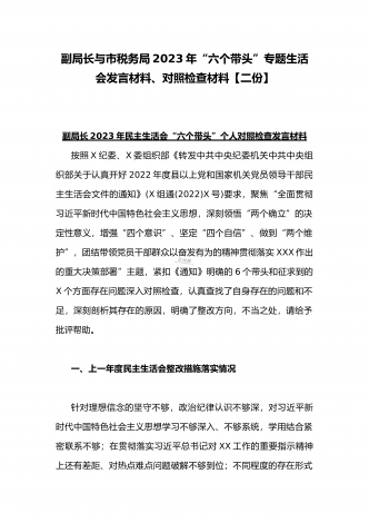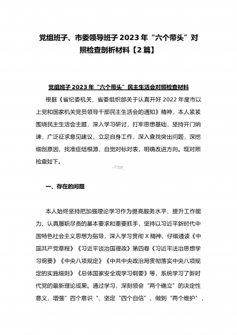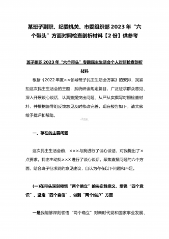 某班子副职、纪委机关、市委组织部2023年“六个带头”方面对照检查剖析材料【2份】供参考班子副职2023年“六个带头”专题民主生活会个人对照检查剖析材料根据《2022年度××领导班子民主生活会方案》的安排,我紧扣这次民主生活会的主题,系统研读规定篇目,广泛征求群众意见、深入开展谈心谈话、认真查摆突出问题、从严从实撰写对照检查材料,并根据督导组反馈意见及时修改完善。现在报告如下,请大家给予批评和帮助。一、存在的主要问题这次民主生活会前,×××与我进行了谈心谈话,对我提出了×点要求。我也主动找××X...