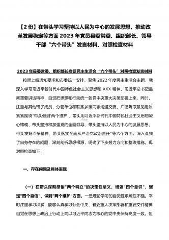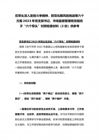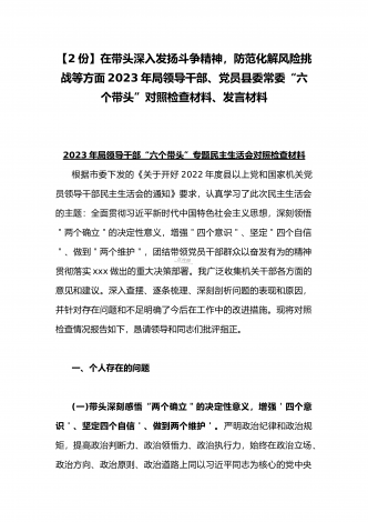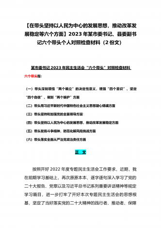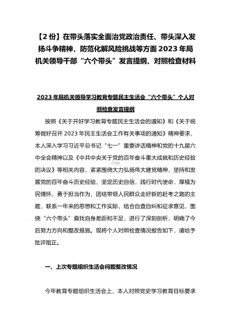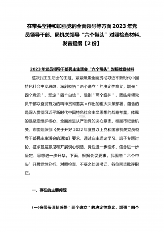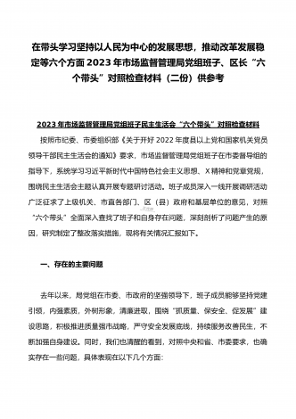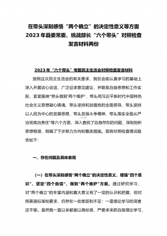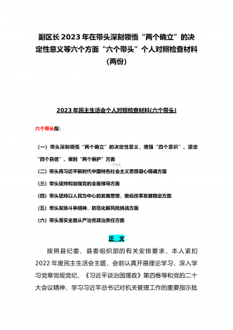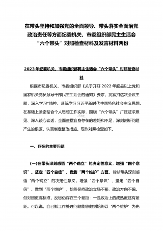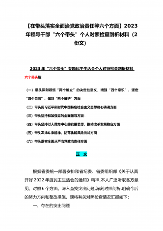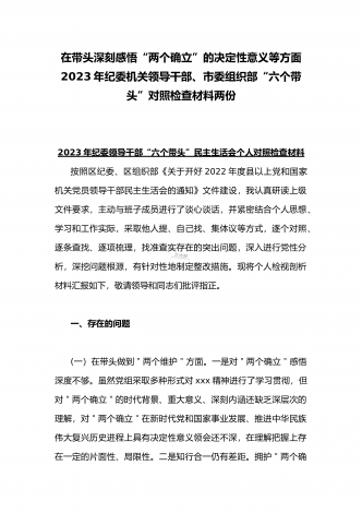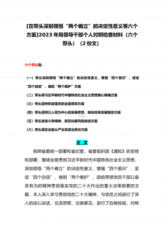 在带头落实全面治党政治责任、带头深刻感悟“两个确立”的决定性意义等六个方面2023年常委领导班子、市政府办公室主任“六个带头”对照检查材料供参考(合编稿2份)2023年常委领导班子民主生活会个人“六个带头方面”对照检查材料按照《关于开好2022年度县以上党和国家机关党员领导干部民主生活会的通知》要求,本人紧扣本次民主生活会主题,在深入学习的基础上,结合自身实际和工作情况,对照"六个方面"内容,深入查摆问题不足,深刻剖析问题根源,进一步明确整改措施和努力方向。现作对照检查如下。一、存在的主要问题(...