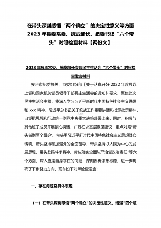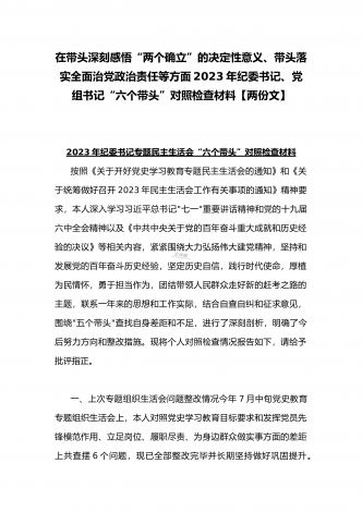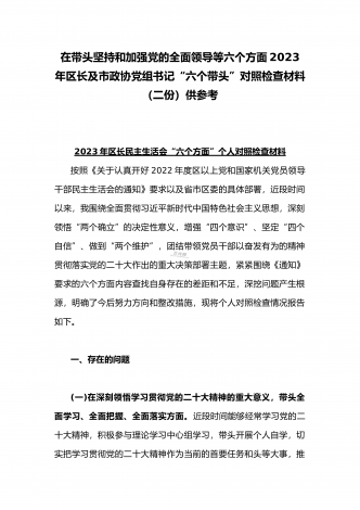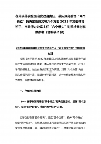 在带头落实全面治党政治责任、带头深刻感悟“两个确立”的决定性意义等六个方面2023年常委领导班子、市政府办公室主任“六个带头”对照检查材料供参考(合编稿2份)