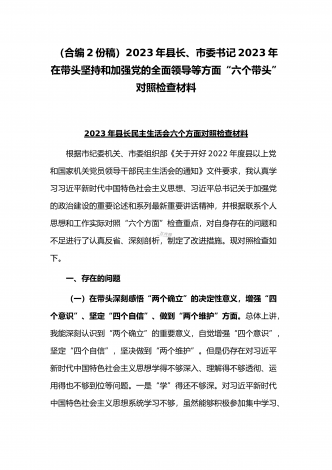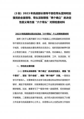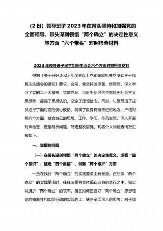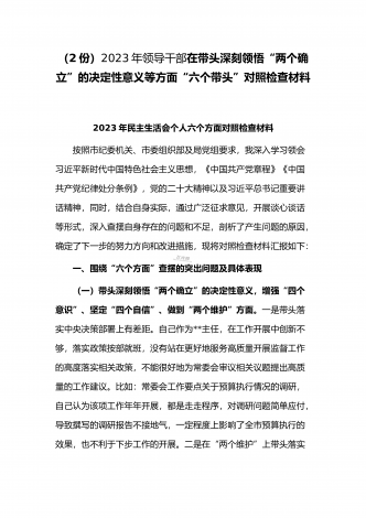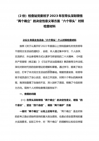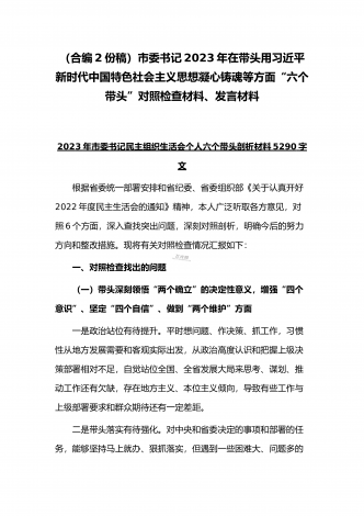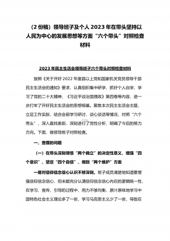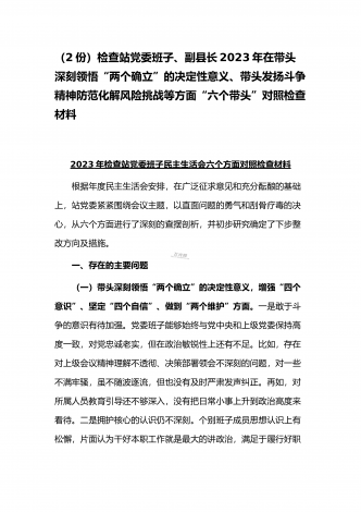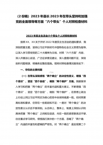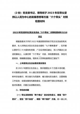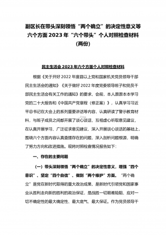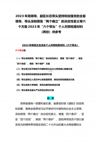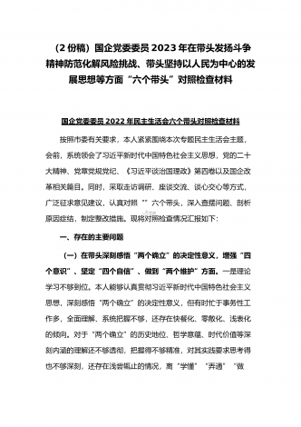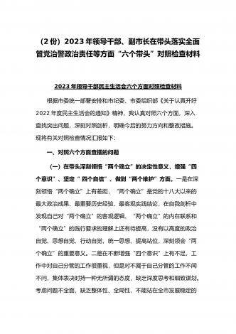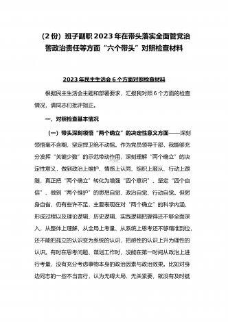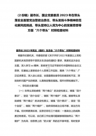 (2份稿)副市长、国企党委委员2023年在带头落实全面管党治警政治责任、带头发扬斗争精神防范化解风险挑战、带头坚持以人民为中心的发展思想等方面“六个带头”对照检查材料