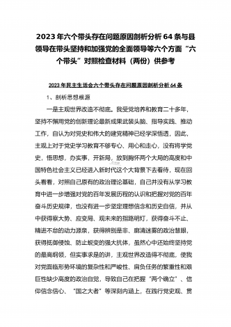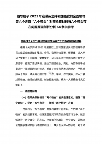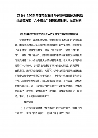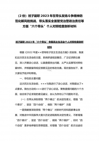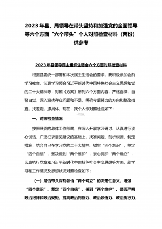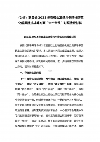 (2份稿)副市长、国企党委委员2023年在带头落实全面管党治警政治责任、带头发扬斗争精神防范化解风险挑战、带头坚持以人民为中心的发展思想等方面“六个带头”对照检查材料副市长2023年民主(组织)生活会“六个带头”对照检查材料根据市纪委机关、市委组织部《关于开好2022年度县以上党和国家机关党员领导干部民主生活会的通知》要求,我紧扣这次会议主题,深入学习xx精神,系统学习习近平新时代中国特色社会主义思想,在基础上紧密结合个人思想工作实际,围绕“六个带头”广泛征求意见、深入谈心谈话,全面查摆自身存在...