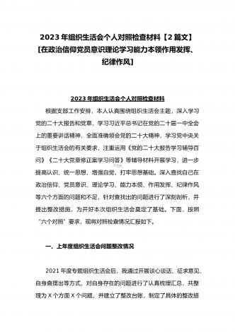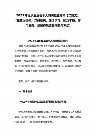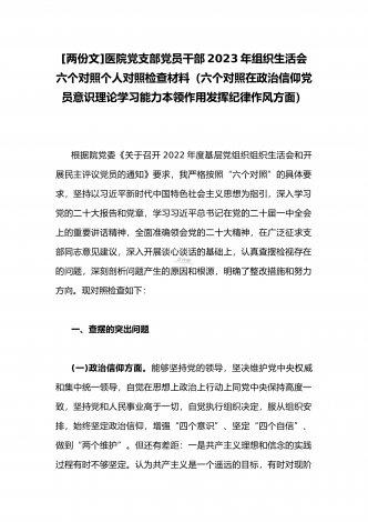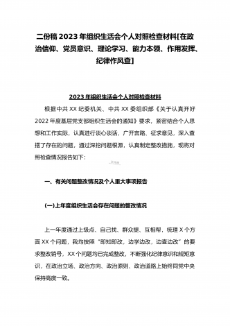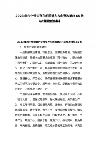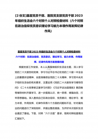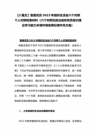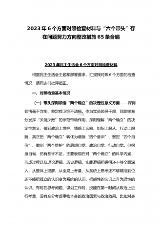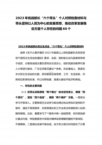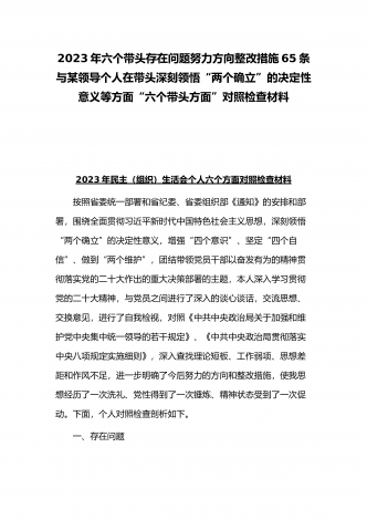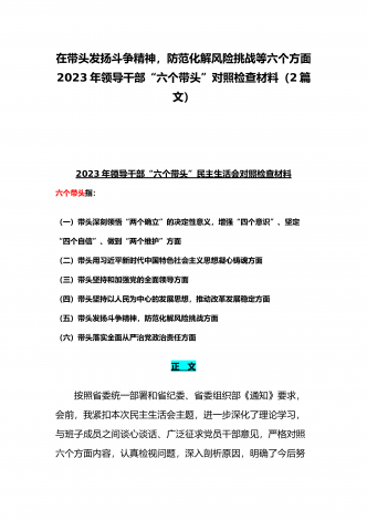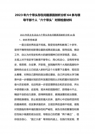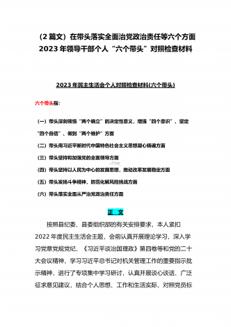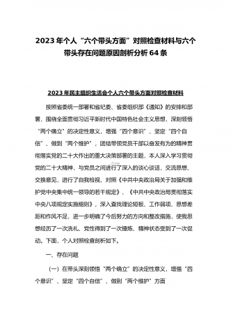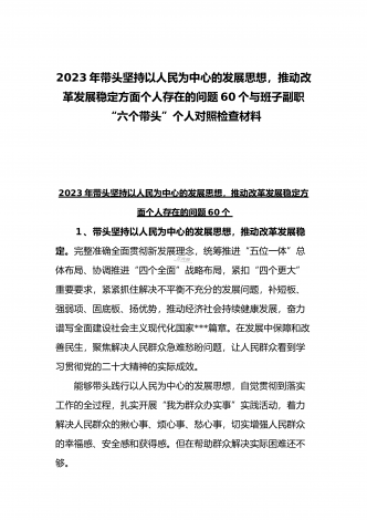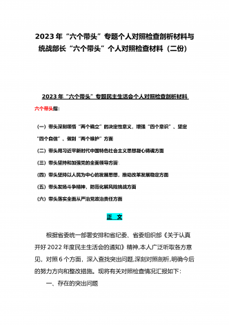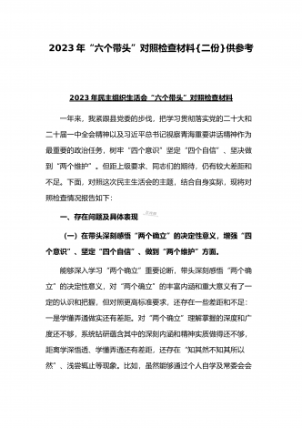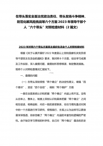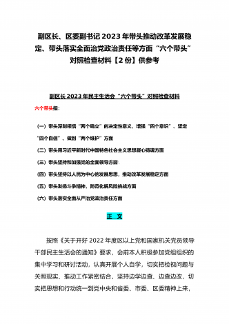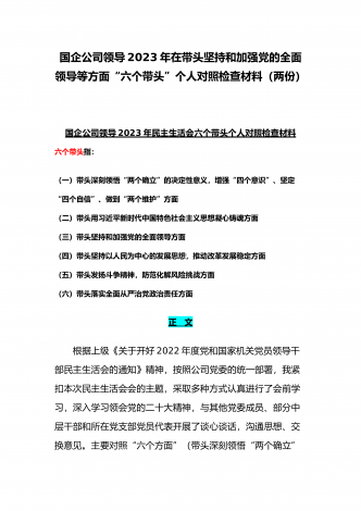 班子副职、国企公司领导2023年在带头坚持和加强党的全面领导、带头坚持以人民为中心的发展思想,推动改革发展稳定等方面“六个带头”个人对照检查材料(两份)班子副职2023年“六个带头”专题民主生活会个人对照检查剖析材料根据《2022年度××领导班子民主生活会方案》的安排,我紧扣这次民主生活会的主题,系统研读规定篇目,广泛征求群众意见、深入开展谈心谈话、认真查摆突出问题、从严从实撰写对照检查材料,并根据督导组反馈意见及时修改完善。现在报告如下,请大家给予批评和帮助。一、存在的主要问题这次民主生活会前...