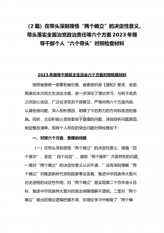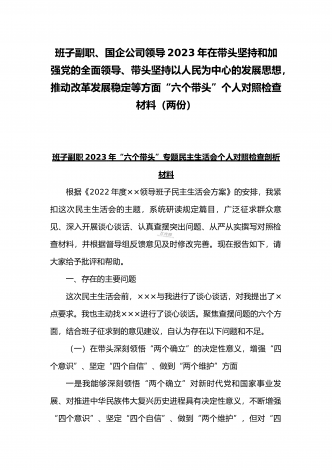 班子副职、国企公司领导2023年在带头坚持和加强党的全面领导、带头坚持以人民为中心的发展思想,推动改革发展稳定等方面“六个带头”个人对照检查材料(两份)