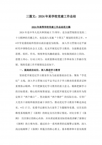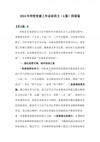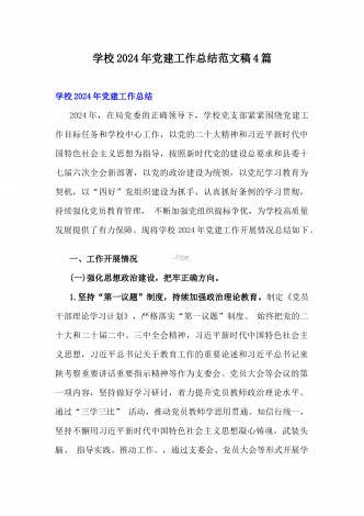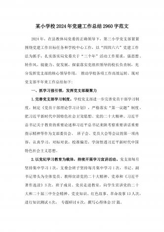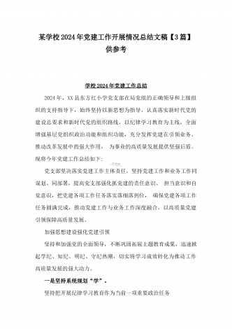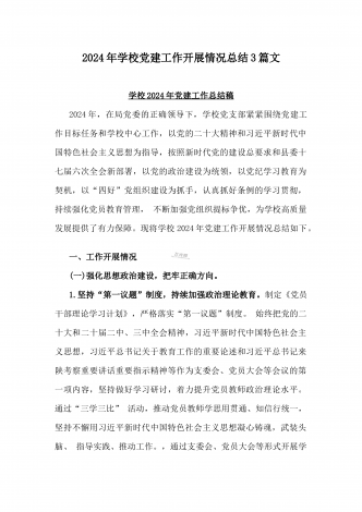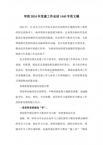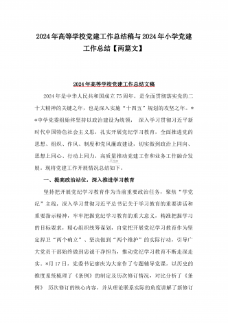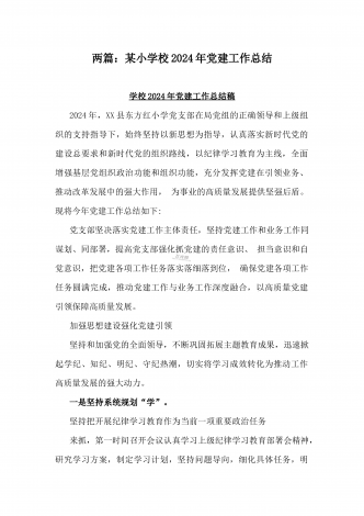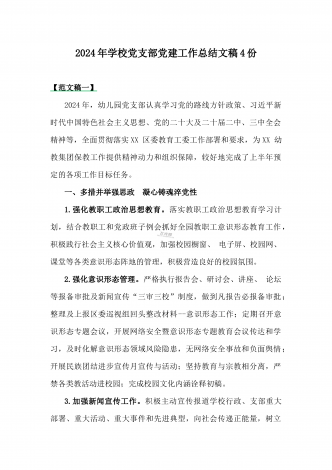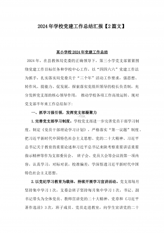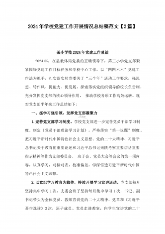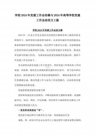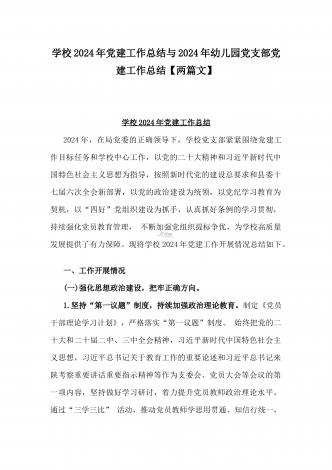 学校2024年党建工作总结与2024年幼儿园党支部党建工作总结【两篇文】