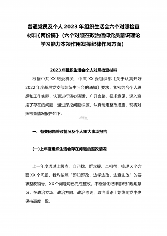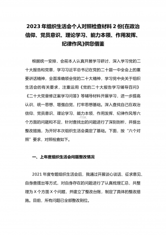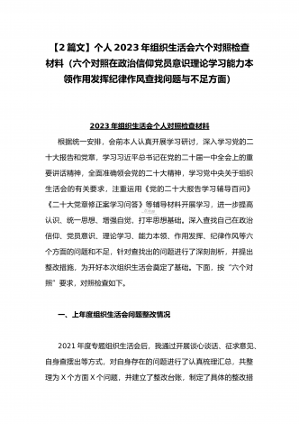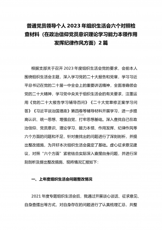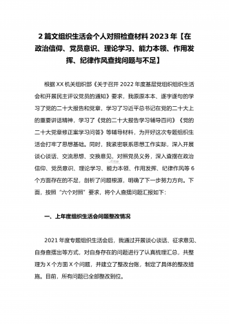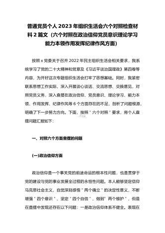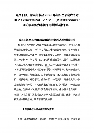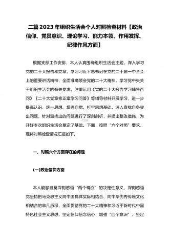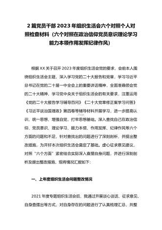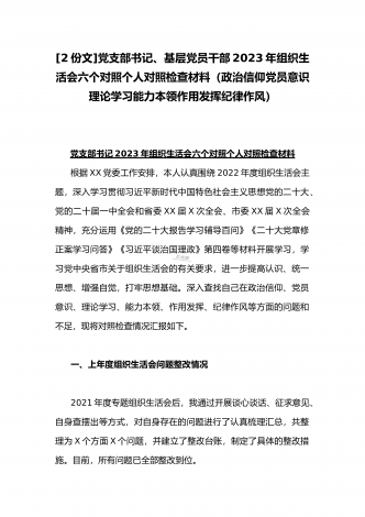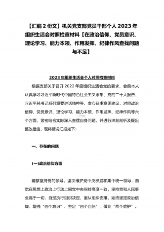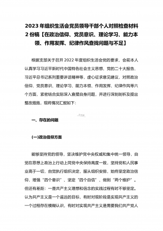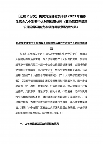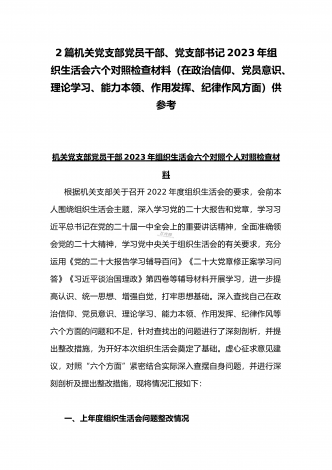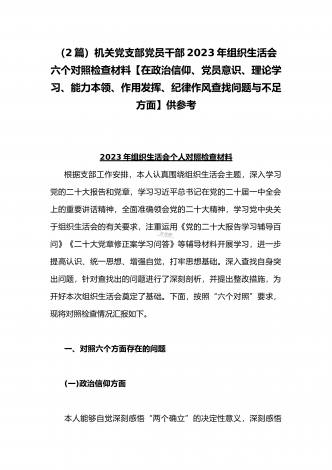 (2篇)机关党支部党员干部2023年组织生活会六个对照检查材料【在政治信仰、党员意识、理论学习、能力本领、作用发挥、纪律作风查找问题与不足方面】供参考