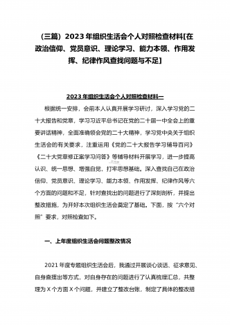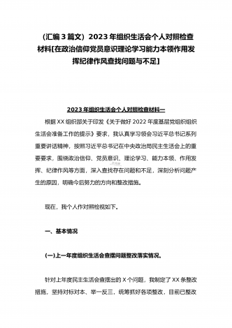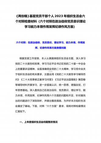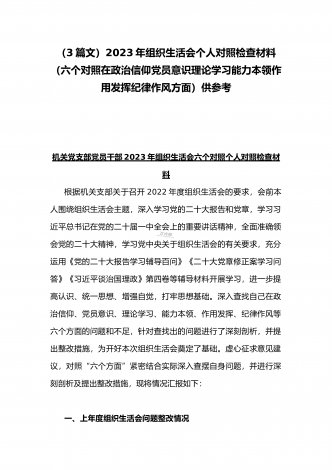 (2篇)机关党支部党员干部2023年组织生活会六个对照检查材料【在政治信仰、党员意识、理论学习、能力本领、作用发挥、纪律作风查找问题与不足方面】供参考2023年组织生活会个人对照检查材料根据支部工作安排,本人认真围绕组织生活会主题,深入学习党的二十大报告和党章,学习习近平总书记在党的二十届一中全会上的重要讲话精神,全面准确领会党的二十大精神,学习党中央关于组织生活会的有关要求,注重运用《党的二十大报告学习辅导百问》《二十大党章修正案学习问答》等辅导材料开展学习,进一步提高认识、统一思想、增强自觉...