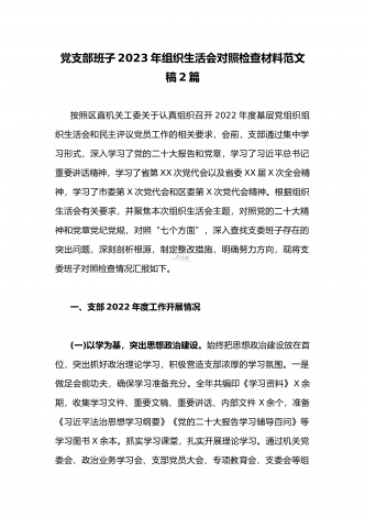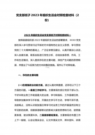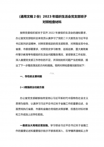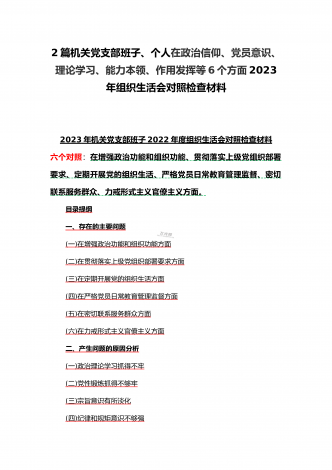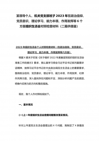 某领导个人、机关党支部班子2023年在政治信仰、党员意识、理论学习、能力本领、作用发挥等6个方面组织生活会对照检查材料(二篇供借鉴)