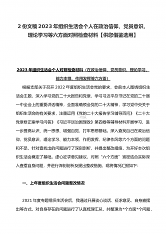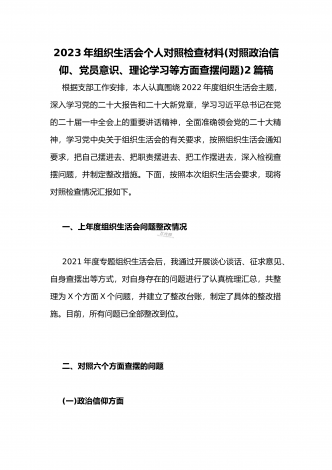 某领导个人、机关党支部班子2023年在政治信仰、党员意识、理论学习、能力本领、作用发挥等6个方面组织生活会对照检查材料(二篇供借鉴)2023年组织生活会个人对照检查材料(在政治信仰、党员意识、理论学习、能力本领、作用发挥等六方面)根据X委关于印发《关于做好2022年度基层党组织组织生活会准备工作的提示》要求,我认真学习领会习近平总书记系列重要讲话精神,按照习近平总书记在中央政治局民主生活会上的重要要求,围绕政治信仰、党员意识、理论学习、能力本领、作用发挥、纪律作风等方面,深入查找存在问题和不足,...