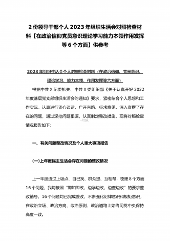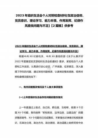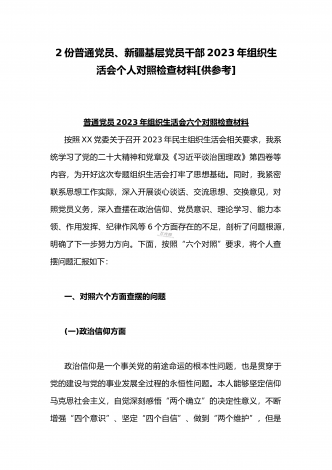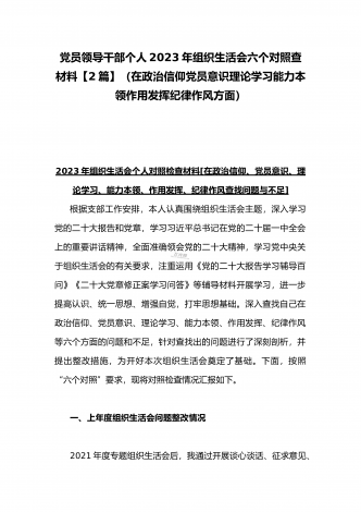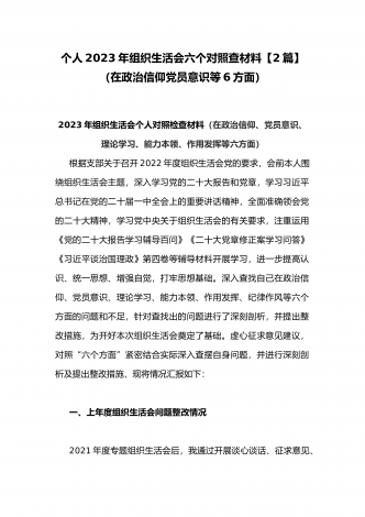 【2篇文】机关党支部党员干部、普通党员2023年组织生活会六个对照个人对照检查材料(六个对照在政治信仰党员意识理论学习能力本领作用发挥纪律作风方面)供参考