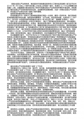 《健全全面从严治党体系,推动新时代党的建设新的伟大工程向纵深发展》是习近平总书记2023年1月9日在二十届中央纪委二次全会上讲话的一部分,收录在《二十大以来重要文献选编》上册。这篇重要文献全面总结了新时代构建全面从严治党体系积累的丰富成果,深刻阐述了健全全面从严治党体系的目标任务、实践要求和战略部署,为进一步健全全面从严治党体系、把全面从严治党引向深入提供了基本遵循。 始终把党的建设摆在突出位置 把党的建设作为一项伟大工程来推进是我们党的一大创举。建党一百多年来,我们党始终把党的建设...