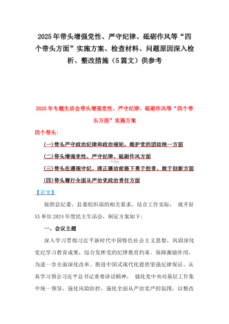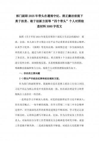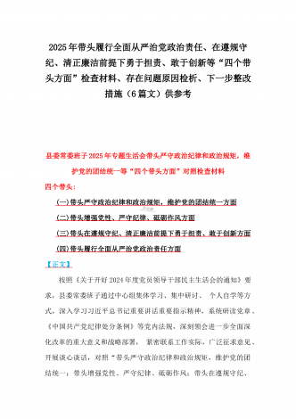 2025年对照带头严守政治纪律和政治规矩,维护党的团结统一、在遵规守纪、清正廉洁前提下勇于担责、敢于创新等“四个带头方面”个人对照检查存在的问题及整改材料【6篇文】供参考“四个带头方面”(一)带头严守政治纪律和政治规矩,维护党的团结统一方面(二)带头增强党性、严守纪律、砥砺作风方面(三)带头在遵规守纪、清正廉洁前提下勇于担责、敢于创新方面(四)带头履行全面从严治党政治责任方面【正文】2025年对照“四个带头"专题民主生活会个人对照检查发言材料根据县委关于开好2024年度民主生活会的相关要求,围绕...