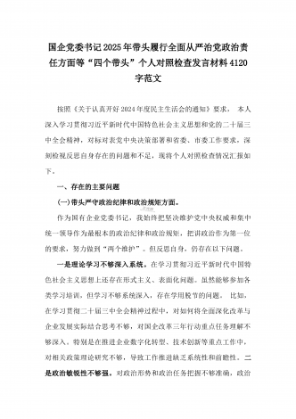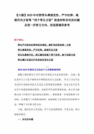 2025年对照带头严守政治纪律和政治规矩,维护党的团结统一、在遵规守纪、清正廉洁前提下勇于担责、敢于创新等“四个带头方面”个人对照检查存在的问题及整改材料【6篇文】供参考