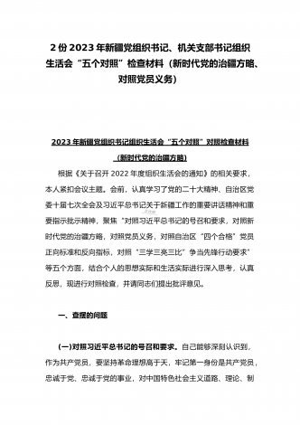 【2篇文】2023年新疆地区书记、基层党员干部组织生活会“五个对照”检查材料(对照新时代党的治疆方略、“三学三亮三比”争当先锋行动要求、党员义务)新疆地区书记2023年组织生活会对照检查材料(新时代党的治疆方略)五个对照:(一)对照习近平总书记的号召和要求。(二)对照新时代党的治疆方略。(三)对照党员义务。(四)对照自治区“四个合格”党员正向标准和反向指标。(五)对照“三学三亮三比”争当先锋行动要求。【正文】按照自治区纪委机关、自治区党委组织部《关于认真开好2022年度组织生活会的通知》要求,本...