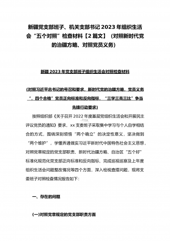 【2篇文】2023年新疆地区书记、基层党员干部组织生活会“五个对照”检查材料(对照新时代党的治疆方略、“三学三亮三比”争当先锋行动要求、党员义务)
