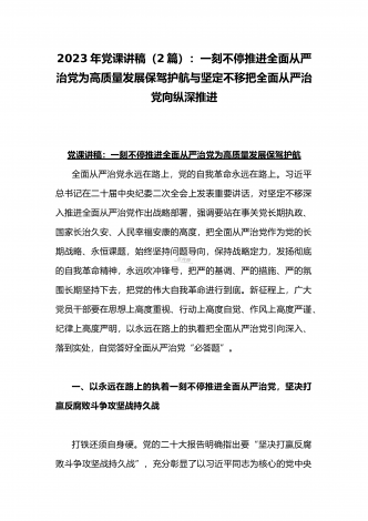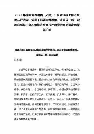 2023年廉政党课讲稿(2篇):在新征程上推进全面从严治党,党员干部要自我鞭策,注重以“新”迎新应新与一刻不停推进全面从严治党为高质量发展保驾护航