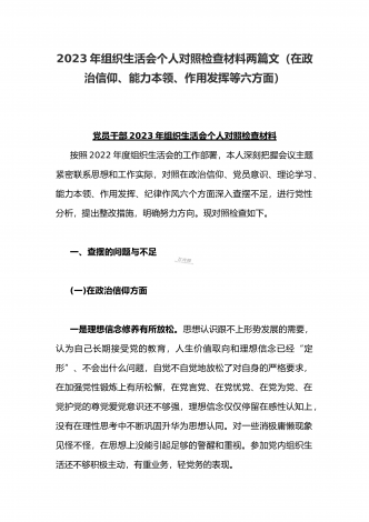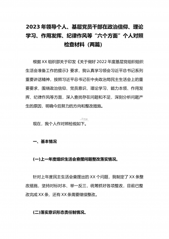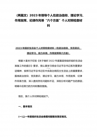 纪检监察干部2023年组织生活会在牢记“国之大者”、对党忠诚、为党奉献等“六个方面”个人发言提纲与党支部班子在强政治功能等“六个方面”对照检查材料(2份)纪检监察干部2023年组织生活会在牢记“国之大者”、对党忠诚、为党分忧、为党尽责、为党奉献等“六个方面”个人发言提纲按照这次组织生活会的安排,自己紧扣会议主题,在认真开展学习、深入开展谈心谈话、广泛征求意见建议的基础上,结合个人思想和工作实际,全面查摆了自身存在的问题,深刻剖析了产生问题的根源,提出了今后努力方向和整改措施。现对照检查如下:一、...