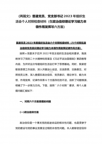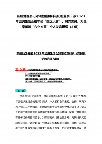 纪检监察干部2023年组织生活会在牢记“国之大者”、对党忠诚、为党奉献等“六个方面”个人发言提纲与党支部班子在强政治功能等“六个方面”对照检查材料(2份)