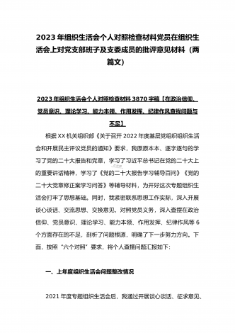 2023年新疆地区副书组织生活会对照新时代党的治疆方略“五个对照”检查材料与医院党支部党员干部在政治信仰等“六个方面”对照检查材料(两篇)2023年新疆地区副书组织生活会五个对照检查材料(新时代党的治疆方略)五个对照:(一)对照习近平总书记的号召和要求。(二)对照新时代党的治疆方略。(三)对照党员义务。(四)对照自治区“四个合格”党员正向标准和反向指标。(五)对照“三学三亮三比”争当先锋行动要求。【正文】按照此次组织生活会的要求,本人紧扣会议主题。会前,认真学习了党的二十大精神、自治区党委十届七...