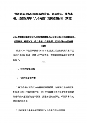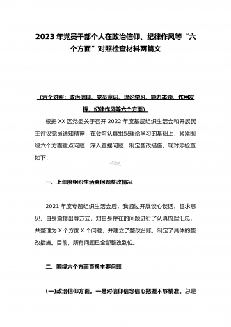 2023年新疆地区副书组织生活会对照新时代党的治疆方略“五个对照”检查材料与医院党支部党员干部在政治信仰等“六个方面”对照检查材料(两篇)