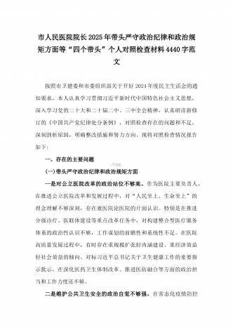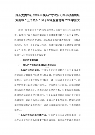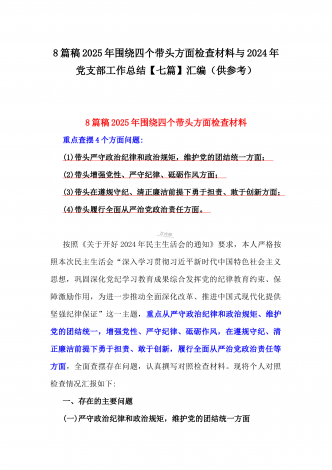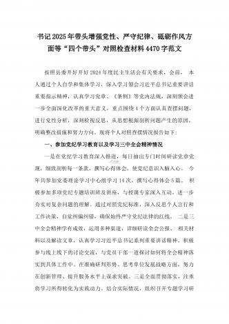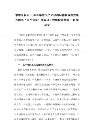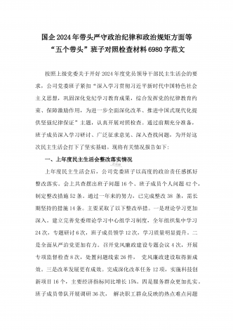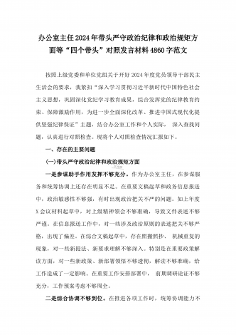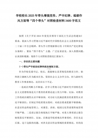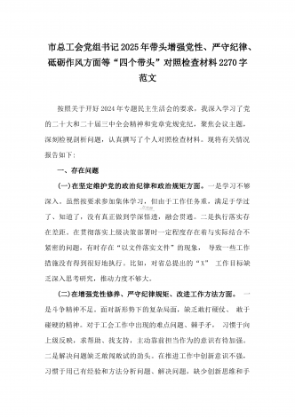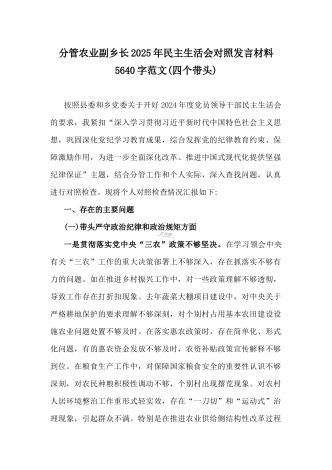 乡党委副书记2025年带头在遵规守纪、清正廉洁前提下勇于担责、敢于创新方面等“四个带头”个人对照检查材料4270字范文按照《关于认真开好2024年度民主生活会的通知》要求,我严格对照“四个带头”方面问题,深入学习贯彻习近平新时代中国特色社会主义思想和党的二十届三中全会精神,通过认真学习、深入思考、对照查摆,现将个人对照检查情况汇报如下。一、存在的主要问题(一)带头严守政治纪律和政治规矩。作为乡党委副书记,我始终坚持把政治建设摆在首位,时刻牢记“两个确立”的决定性意义,坚决做到“两个维护”。但在理...