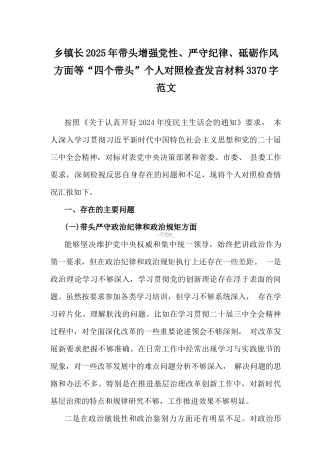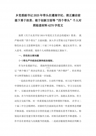 乡党委副书记2025年带头在遵规守纪、清正廉洁前提下勇于担责、敢于创新方面等“四个带头”个人对照检查材料4270字范文