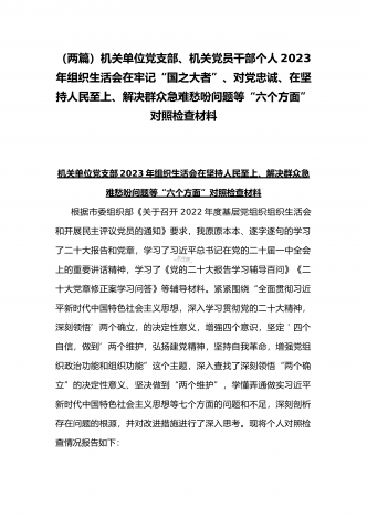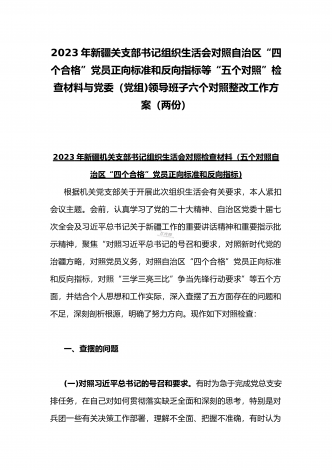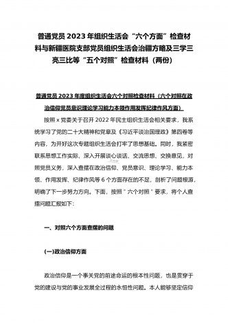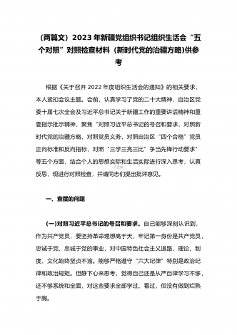 (两篇)2023年组织生活会个人对照检查材料[在政治信仰、党员意识、理论学习等“六个方面”]与新疆党组织书记组织生活会“五个对照”对照检查材料(新时代党的治疆方略)供参考
