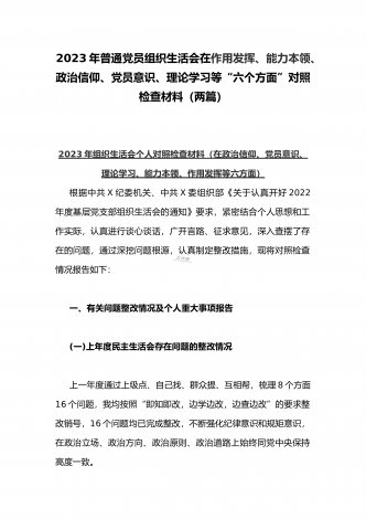 (两篇)2023年组织生活会个人对照检查材料[在政治信仰、党员意识、理论学习等“六个方面”]与新疆党组织书记组织生活会“五个对照”对照检查材料(新时代党的治疆方略)供参考2023年组织生活会个人对照检查材料[在政治信仰、党员意识、理论学习、能力本领、作用发挥、纪律作风查找问题与不足]根据中共XX纪委机关、中共XX委组织部《关于认真开好2022年度基层党支部组织生活会的通知》要求,紧密结合个人思想和工作实际,认真进行谈心谈话,广开言路、征求意见,深入查摆了存在的问题,通过深挖问题根源,认真制定整改...