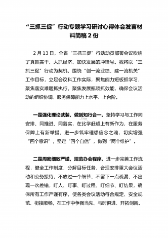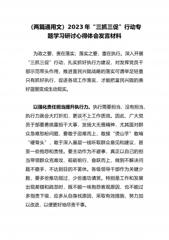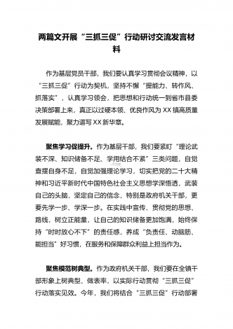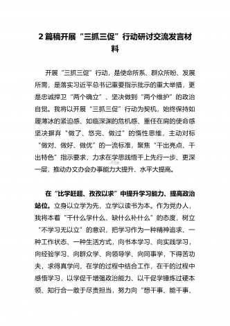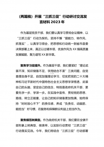 2023年“三抓三促”行动专题学习研讨心得体会发言材料(通用文稿两篇)