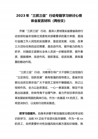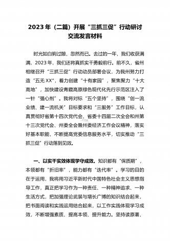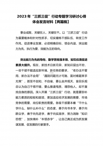 2023年“三抓三促”行动专题学习研讨心得体会发言材料(通用文稿两篇)事业成败,关键在人,关键在干。以“三抓三促”行动为重要载体和针对性抓手,切实锤炼干部队伍、转变工作作风、促进事业发展,必须明确目标、领会内涵,突出能力为先、执行为要、效能为王的导向。突出能力为先的导向,勤学苦练强本领、如饥似渴促进素质大提升。现在,新技术日新月异、新知识层出不穷,一些干部不能适应新环境、新任务的要求,“老办法不管用、新办法不会用”“遇到问题无计可施、面对难题束手无策”,甚至不自知、不自省,要么坐井观天、盲目乐观...