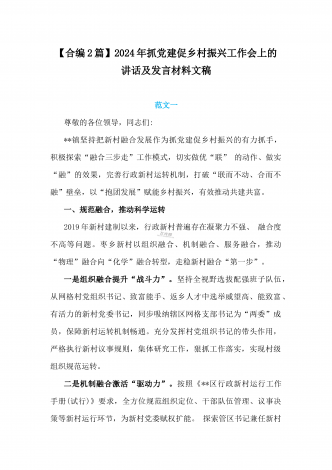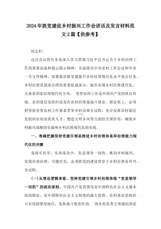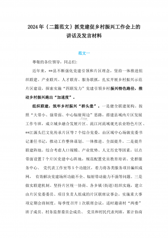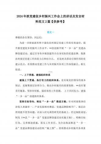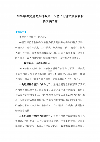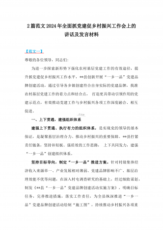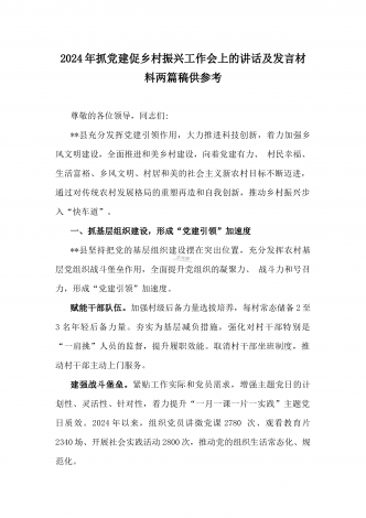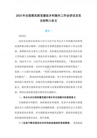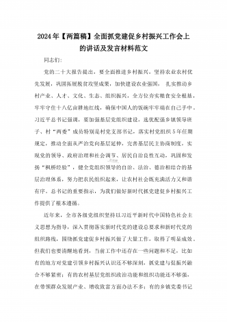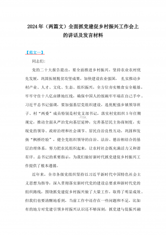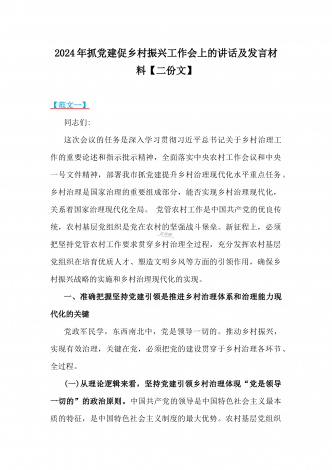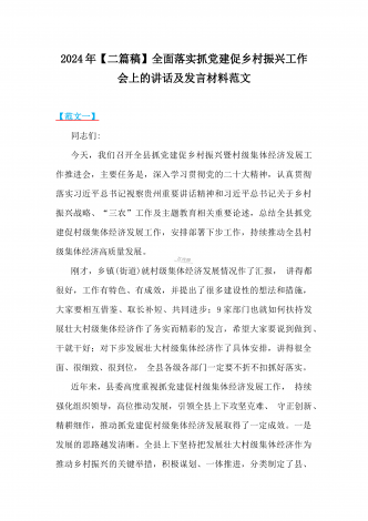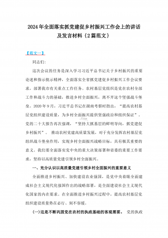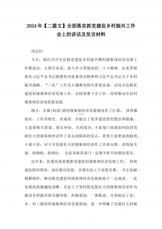 2024年【二篇稿】全面落实抓党建促乡村振兴工作会上的讲话及发言材料范文