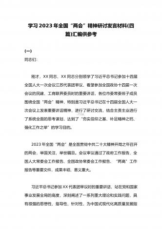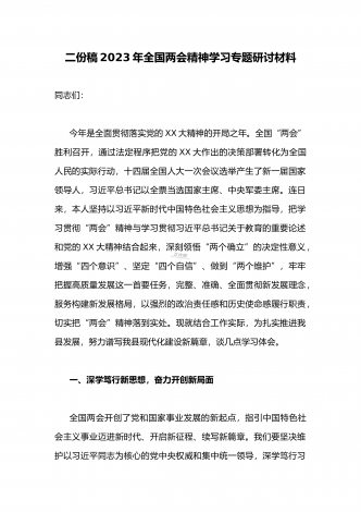 2023年党员干部专题学习贯彻全国“两会”精神交流会上的发言稿(两篇)2023年专题学习贯彻全国“两会”精神交流会上的发言稿同志们:这次全国“两会”是全面贯彻落实党的XX大精神开局之年、全面推进中国式现代化国家新实践的关键之年,召开的一次十分重要的会议,对中国未来五年和今年工作进行了系统安排部署,必须从政治的高度、战略的深度、全局的广度,在全面学习、全面把握、全面落实全国“两会”精神上下功夫,推动全国“两会”精神落地生根、结出硕果。一、以“学”为先,强基铸魂,筑牢高质量发展的根本保证。回顾过去的...