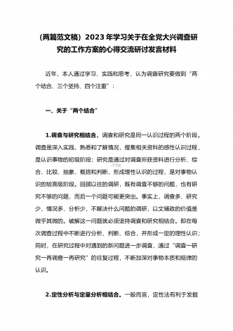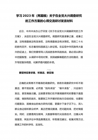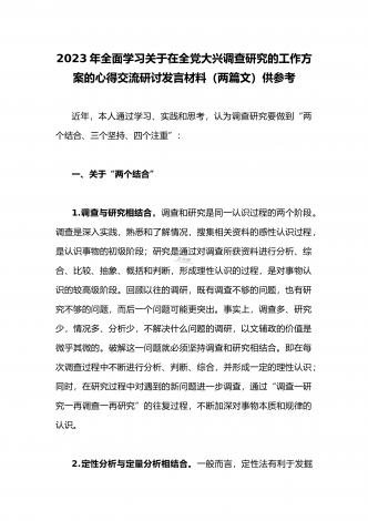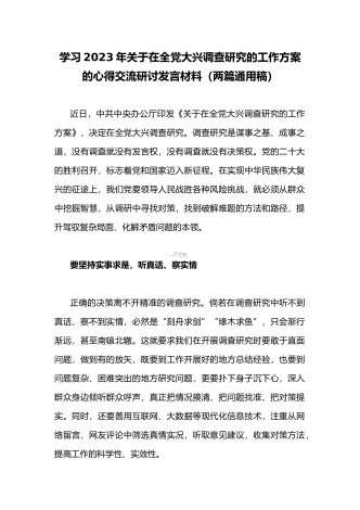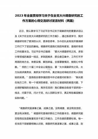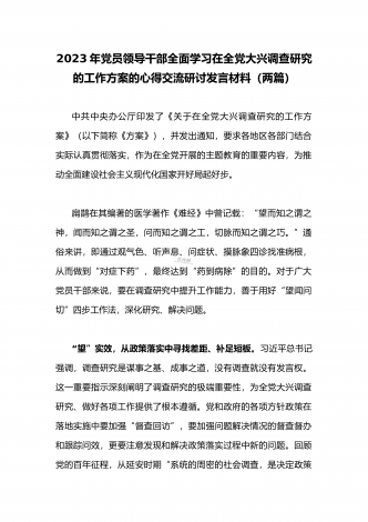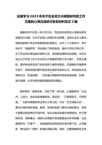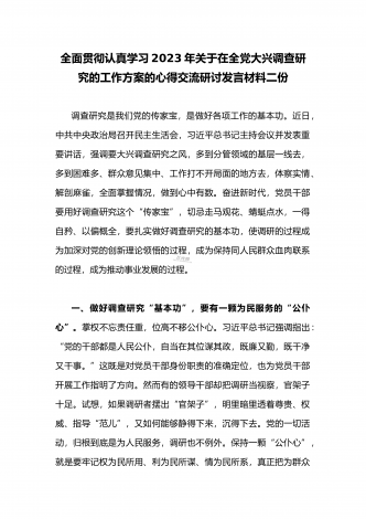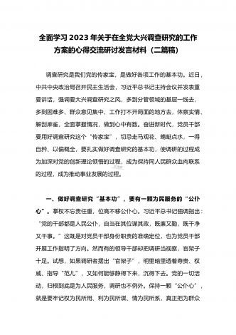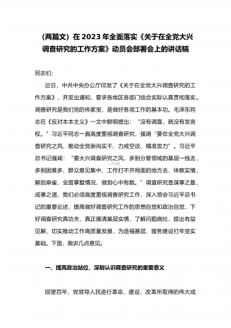 2023年领导干部在全面落实《关于在全党大兴调查研究的工作方案》动员会部署会上的讲话稿2篇文