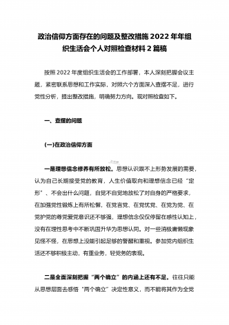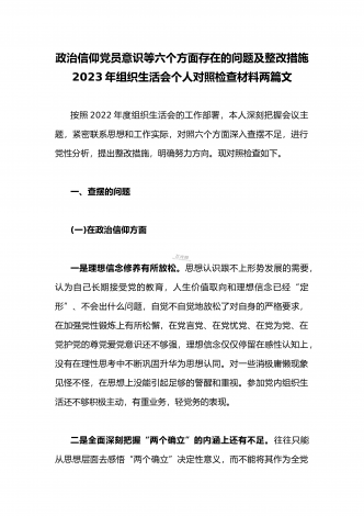 (2篇文供参考)政治信仰等“六个方面”存在的问题及整改措施2023年组织生活会个人对照检查材料