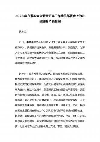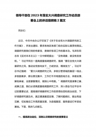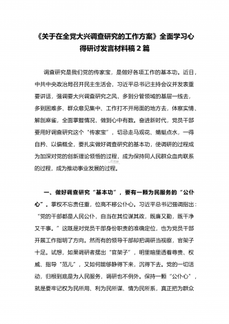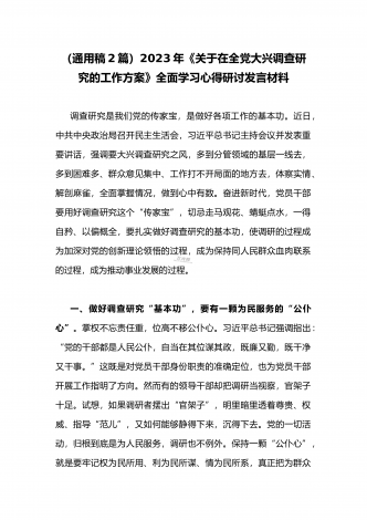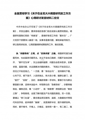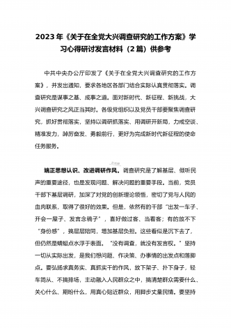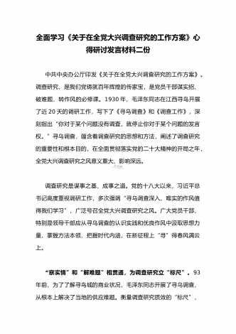 2023年《关于在全党大兴调查研究的工作方案》全面学习心得研讨发言材料(2篇文)供借鉴