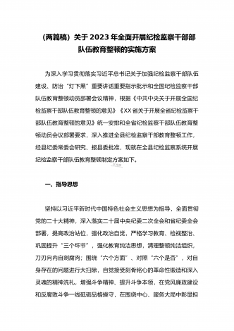 2023年关于全面开展纪检监察干部部队伍教育整顿的实施方案(两份范文)根据全国纪检监察干部队伍教育整顿动员部署会议精神,根据X纪委监委相关工作安排,为加强对本X纪检干部队伍教育整顿工作的领导,推动整顿工作有序开展,严密组织实施,切实把教育整顿成果转化为履职尽责、推动纪检工作高质量发展的强大动力,充分发挥纪检监察机关在推进中国式现代化进程中肩负重要使命、发挥重要作用,以纪检工作高质量助推机关党建工作高质量。特制定本实施方案。一、总体要求坚持以习近平新时代中国特色社会主义思想为指导,全面贯彻党的二十...