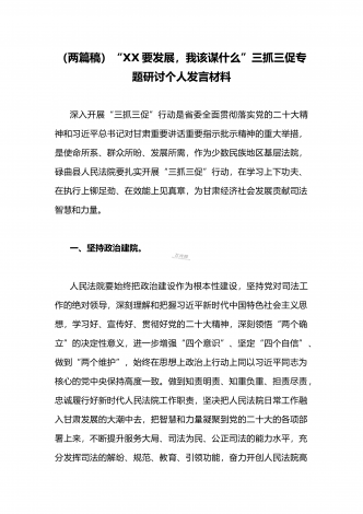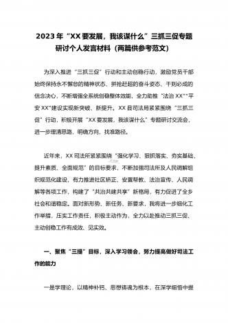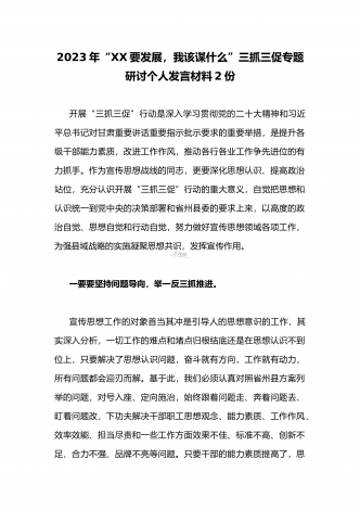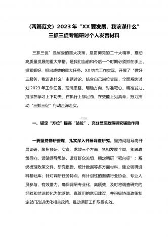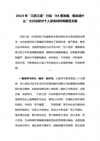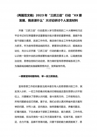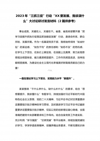 (两篇范文稿)2023年“三抓三促”行动“XX要发展、我该谋什么”大讨论研讨个人发言材料