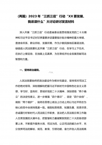 (两篇范文稿)2023年“三抓三促”行动“XX要发展、我该谋什么”大讨论研讨个人发言材料开展“三抓三促”行动是深入学习贯彻党的二十大精神和习近平总书记对甘肃重要讲话重要指示批示要求的重要举措,是提升各级干部能力素质,改进工作作风,推动各行各业工作争先进位的有力抓手。作为宣传思想战线的同志,更要深化思想认识、提高政治站位,充分认识开展“三抓三促”行动的重大意义,自觉把思想和认识统一到党中央的决策部署和省州县委的要求上来,以高度的政治自觉、思想自觉和行动自觉,努力做好宣传思想领域各项工作,为强县域战...